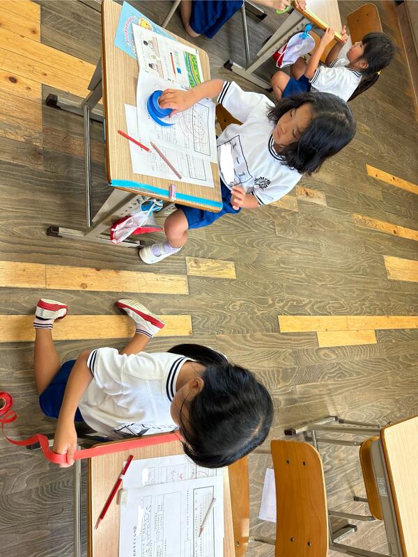 この時間では、机がドアから出すことができるか、というめあてがあり、紙テープを使って長さをはかることで、長さを比べていました。