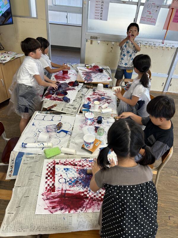 今回の図工では、トイレットペーパーの芯やカップなどの材料に絵の具をつけて、大きな紙にスタンプのように押したり、コロコロところがしたりして、自分の作品を作り上げていました。子どもたちは、家庭からもってきた材料を使って、自分なりに考えて表現していました。紙コップを使って花火を表現したり、丸をいくつも重ねてぶどうを作ったりするなど、たくさんの工夫が見られました。