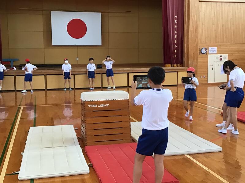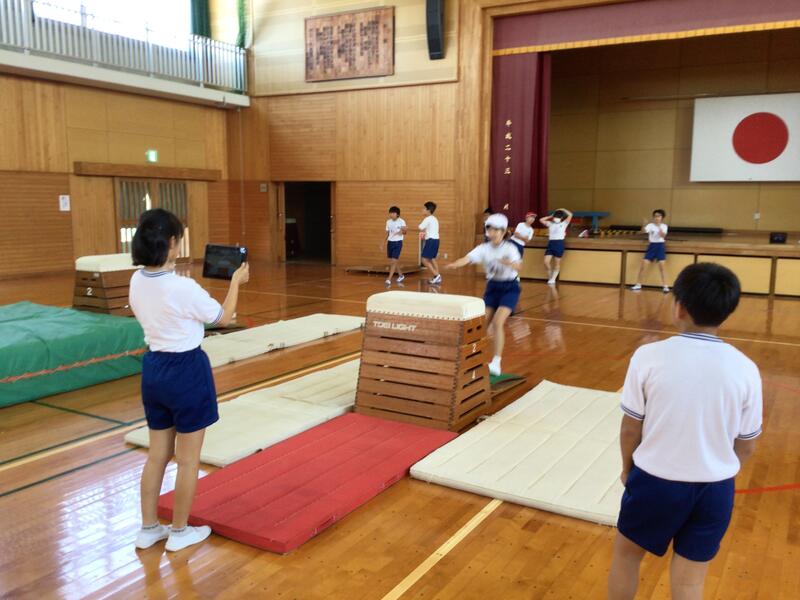 体育の授業では、跳び箱運動を行ってきました。高学年では、「抱え込み跳び」・「伸膝台上前転(大きな台上前転」・「頭はね跳び」の3種類を学ぶことになっています。いずれもかなり高度な技なので、これまで学習した台上前転も含めて練習をしてきました。自分に合った跳び箱を考えて用意し、めあてをもって取り組むことを重視しました。練習を重ねてきたら、タブレットPCで動画撮影し、良い点や課題を確認し合う場面も設定し、さらに練習を重ねることができました。頭はね跳びができる子もいたので、安全(けが)には十分取り組みながら、頑張っていました。