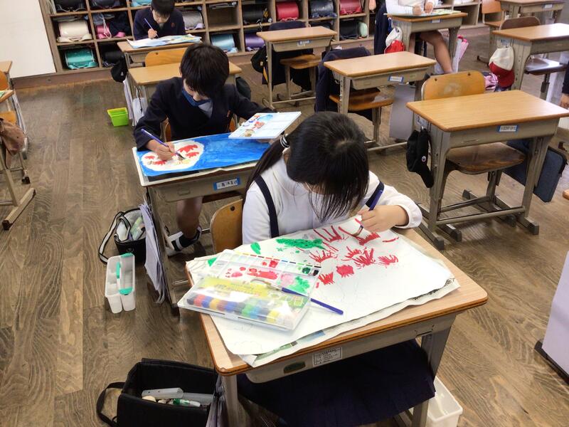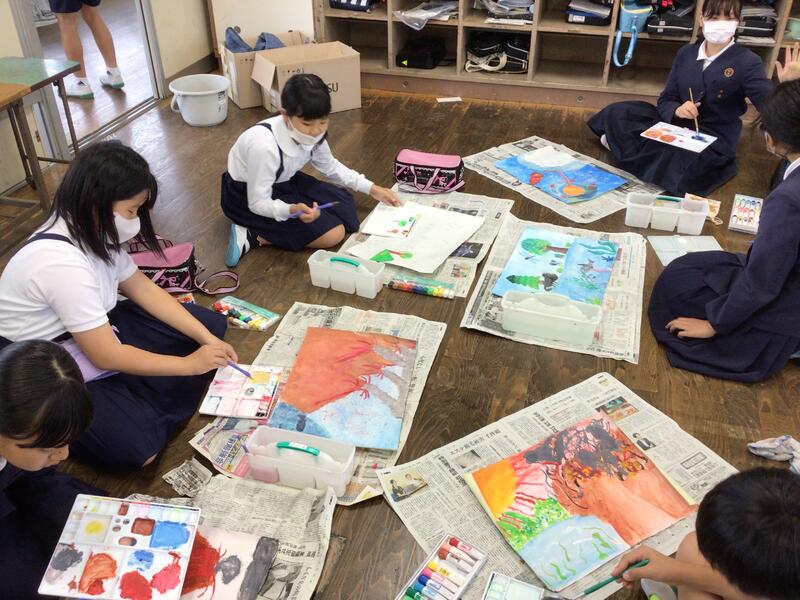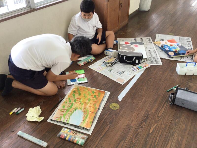 図工では、読書感想画に取り組んでいます。今回は、課題図書「気候変動のれきし」に取り組んでいます。教室だけでなく、自分が取り組みやすい場所を選び、一生懸命頑張っています。色の塗り方やどんな感想をもって絵に表したいかを意識しながら取り組んでいます。来週完成予定です。色を塗り込んで、より良い作品になるように、声かけを続けていきます。