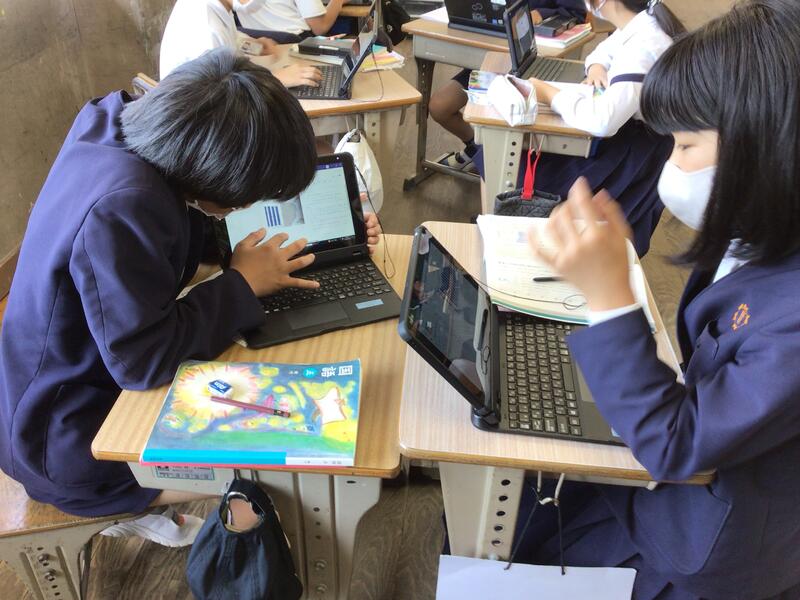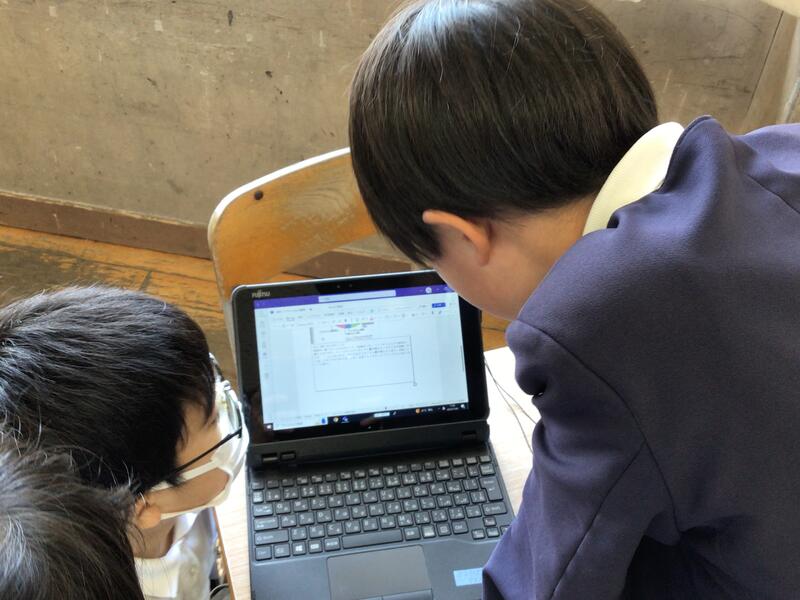 2日(木)は、自分で選んだ統計資料を読み取ったり、結果に対する推測(考察)を考える時間でした。タブレットPC(Microsoft Teams)を用いて、同じ資料を用いる人同士で集まって、様々な考えを交流し合いました。そこで出た意見を記録者が記録しておくことで、グループ全員で話し合った内容を一人一人が記録画面を見ながら確認できるようにしています。
