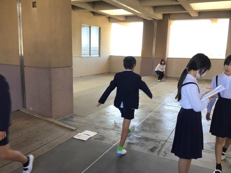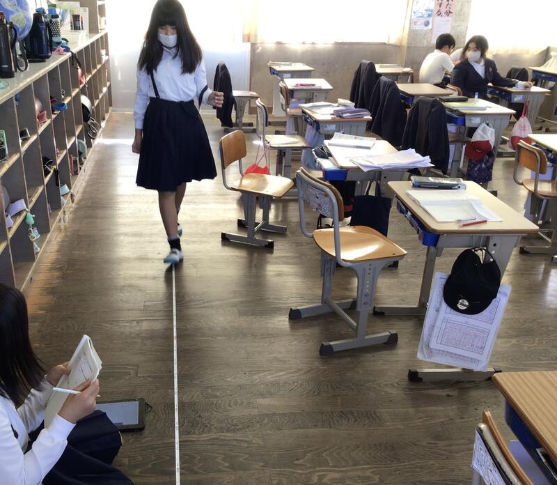 8日(水)の5時間目には、班のメンバー1人の歩幅測定を行いました。10歩で歩いた距離を5回測定し、そこから、平均を求めていきました。変に力を入れず、自然に歩くように意識しながら取り組んでいました。