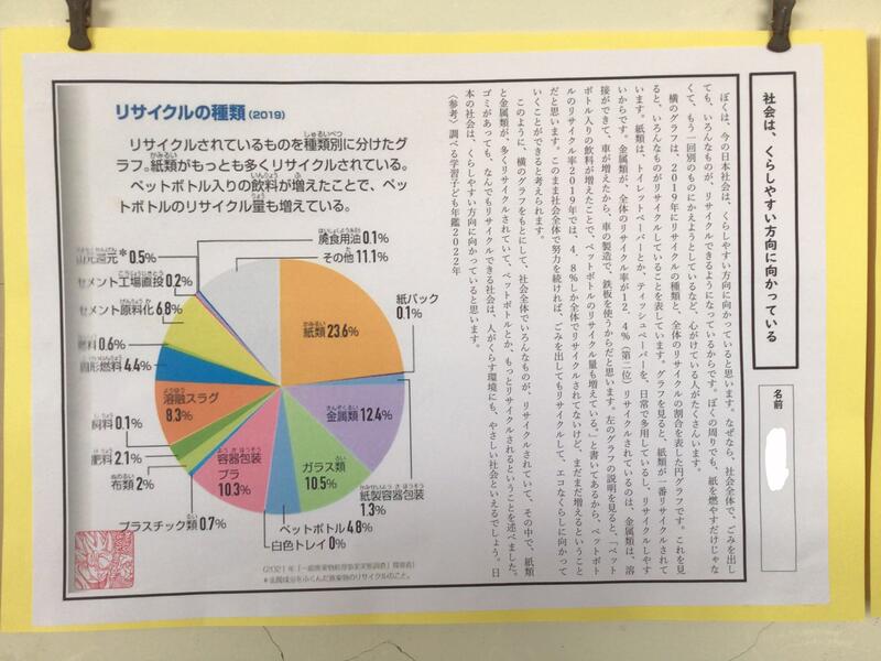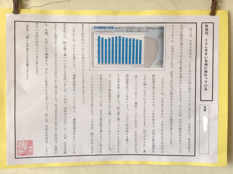国語の授業では、「今、生きている社会が、暮らしやすい方向に向かっているか」について、統計資料を用いて、自分の考えを書く(意見文を書く)学習をしています。説明文「固有種が教えてくれること」で、統計資料を活用した説明の仕方のポイントを学び、それを生かして、意見文を書きます。