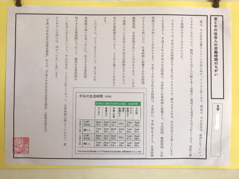 以前(11月6日に投稿)、統計資料を用いて意見文を書くために、同じ資料を用いる者どうしで分析し合う学習を紹介しましたが、先週末で完成することができました。殆どの児童がWordを使って作成しました。タイピング技能も
