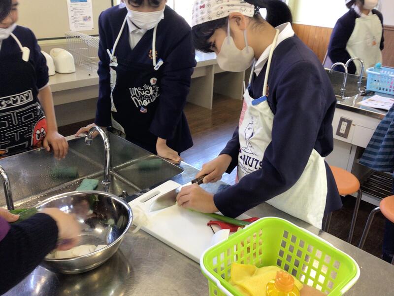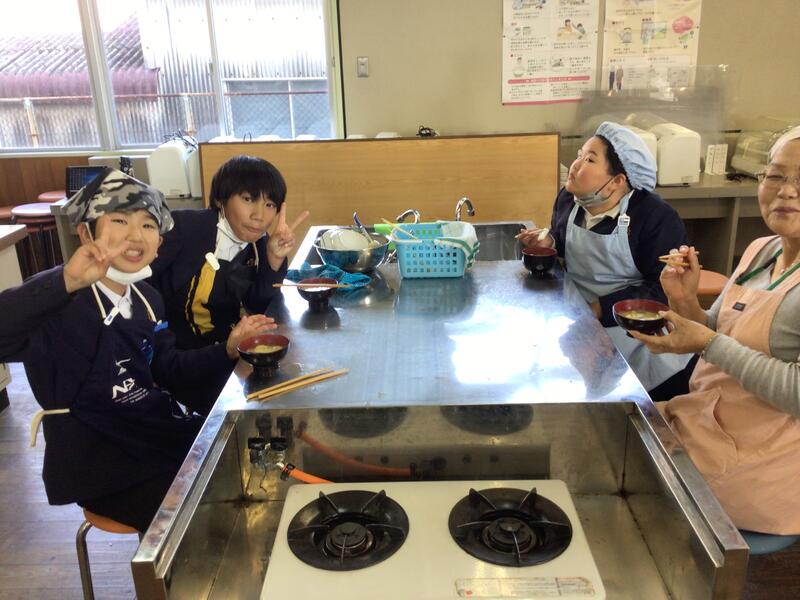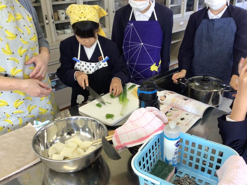 先週、炊飯の実習を行いましたが、22日(水)は、味噌汁づくりを行いました。教科書に沿って、大根・油揚げ・長ネギを入れて調理しました。今回は、婦人会の方々に来ていただいて、お手伝いいただきました。来ていただいたおかげで、活動を円滑に進めることができました。本当にありがとうございました。