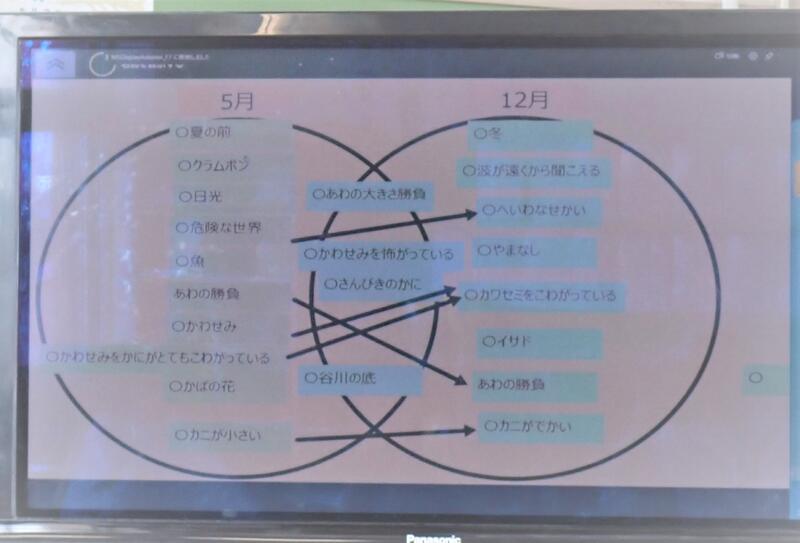 本文の内容をベン図にまとめることで、5月と12月の違いや共通点を自分のタブレット端末の中に保存していました。