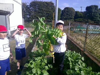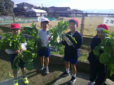 28日(水)に、大根の収穫をしました。2学期に種をまき、間引きなどの作業をしながら育てたところ、土の中には大きな大根が育っていました。