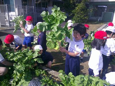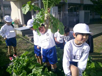 なかなか一人では抜けない子供もいましたが、友達に手伝ってもらってなんとか抜いていました。家に持って帰って、「おでんにしてもらう!」や「みそ汁に入れて食べたい!」などと、収穫の喜びを口にしていました。