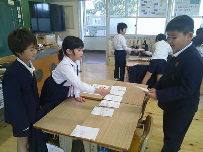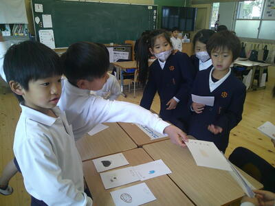 ペットショップ、おかしやさん、おすしやさん、くだものやさん、コンビニエンスストアの5つのお店があり、売る側も買う側も楽しく活動していました。お店の品物が全部売れると、「買ってもらってうれしかった」「買いたい物が買えてよかった」などの感想が発表されて、みんなとても満足そうでした。