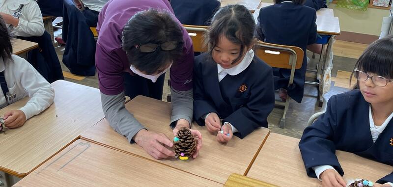 2時間目は、婦人会の方が持ってきてくださった大きなまつぼっくりを使って、ミニツリーを作りました。作り方を教えてもらって、世界に一つだけの素敵なツリーができました。