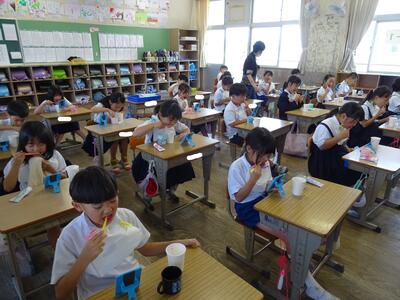 6/4(火)に、養護教諭と一緒にむし歯予防についての授業を行いました。。給食の後の授業で、歯磨きをした後でしたが、磨き残しが多くある。ということを歯こう染め出しを用いて子どもたちは実感することができたと思います。