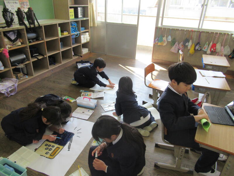図工の時間には、道具作りをしています。チームを組んで、お互いにアイデアを出し合いながら、協力して取り組む姿が見られています。