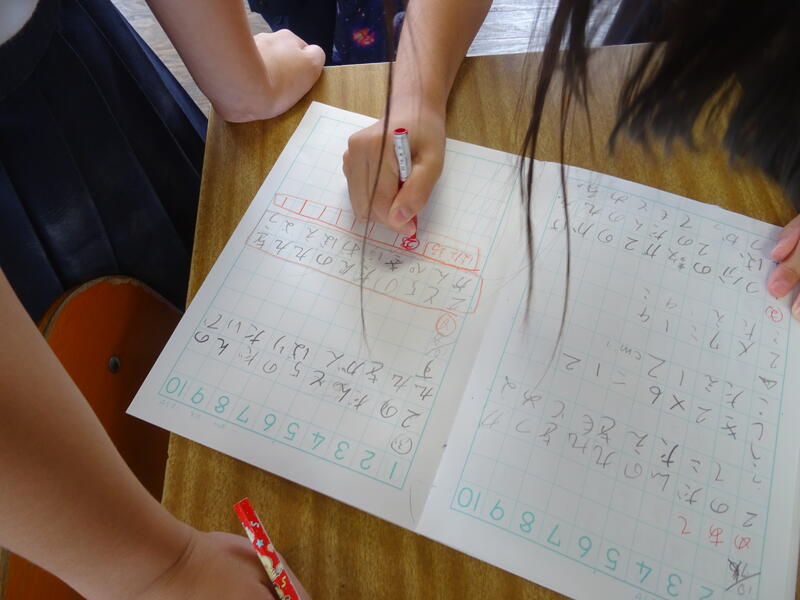 ペアでの言い合いで間違えずに言うことができたら、友だちに花丸をもらいました。花丸が5個たまったら、先生のところへ行って、早く言えるかのタイムチャレンジをしました。