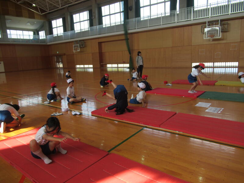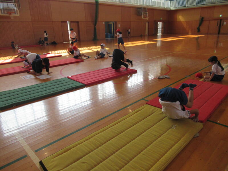 回転技や倒立技など、全部で13種類の技に挑戦しています。技のポイントを意識しながら、一つでも多くの技ができるように、それぞれが目標をもって取り組んでいます。これからも安全に気をつけながら頑張ります!