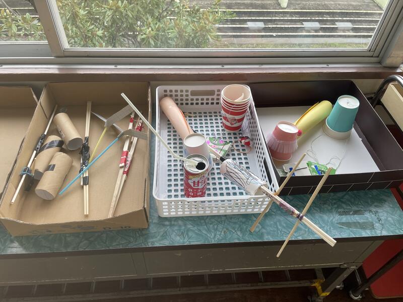 運動場で作ったおもちゃで遊びました。飛ぶおもちゃが楽しかったようです。