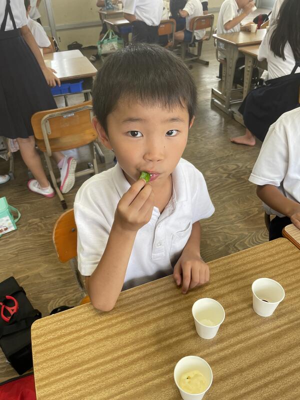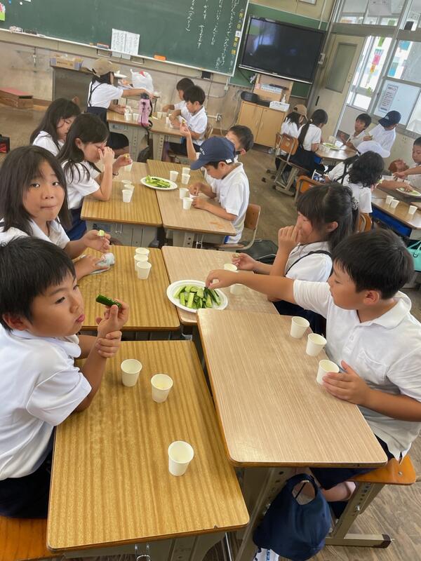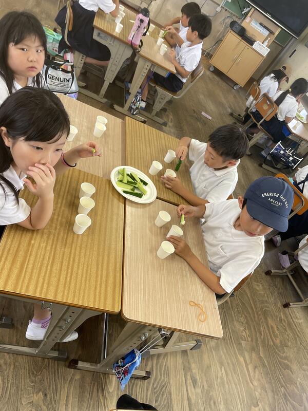 生活科で育てた野菜がとても大きく育ちました!今日はみんなで野菜パーティです。きゅうりとピーマンを、お好みのマヨネーズや塩、ケチャップで食べました。自分たちで育てた野菜だからいつも以上に美味しく感じられた様子でした。