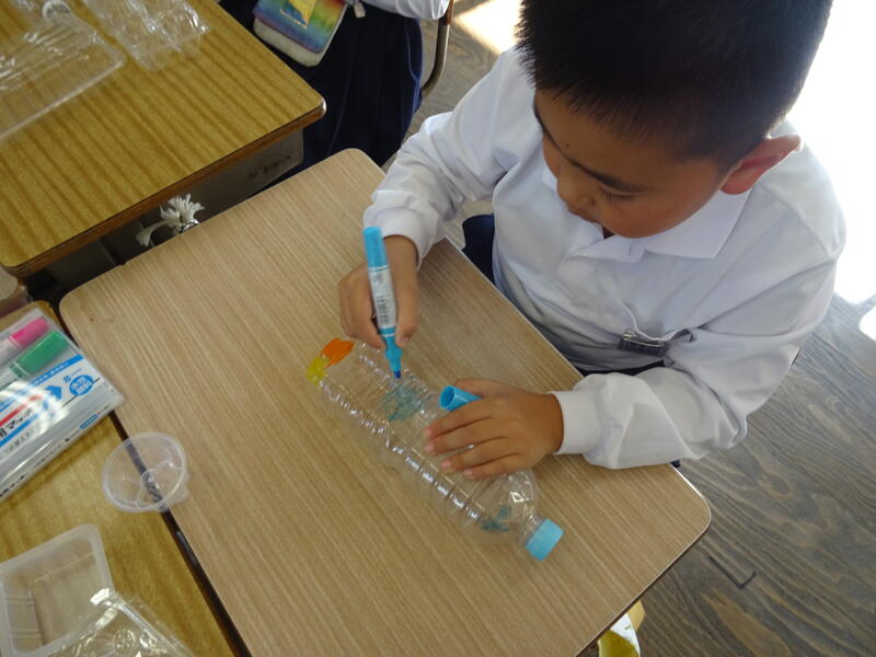 図画工作で、「光のプレゼント」の学習を行いました。透明なプラスチックの材料にペンで色をつけていきました。