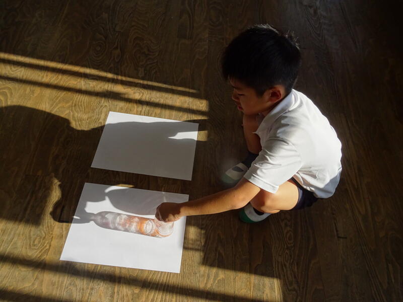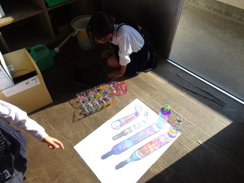 色塗りがおわったら、太陽の光が当たる場所に行き、光を通して色や形の変化を確認していました。