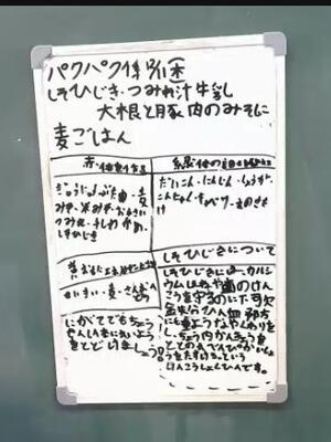 前回、「(係活動の)パクパク係では、毎日の献立をホワイトボードに書いて紹介しています」と活動の様子をお伝えしました。その活動がさらにパワーアップしましたので再び紹介します。
