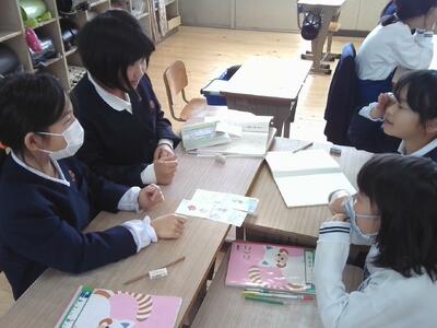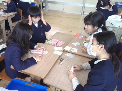 2学期に、音読みと訓読みの学習をしましたが、3学期の学習では同じ漢字で違う読み方をするものを用いて、かるた作成をしました。そして、みんなでかるた遊びをしました。