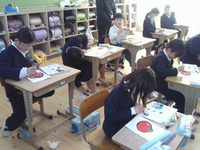 3年生は、「郡築のおいしい野菜」をテーマに描きました。さすが郡築の3年生、「トマトがいいかな?いや、白菜の方が・・・」とまず話し合いをしっかり行ってから描く野菜を決めていました。
