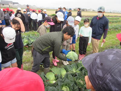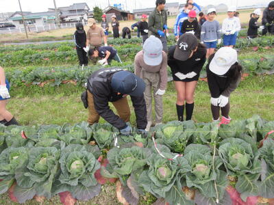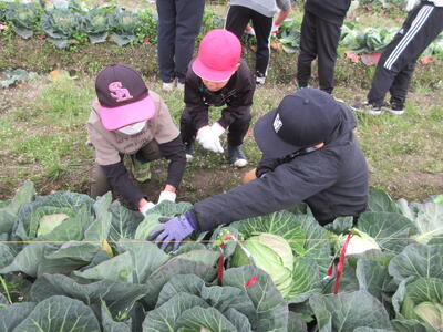 10月植えたキャベツの苗植えが成長し、本日収穫しました。子供たちは、3人1組になり、JA青壮年部の方に教えていただきながら包丁を使って収穫しました。