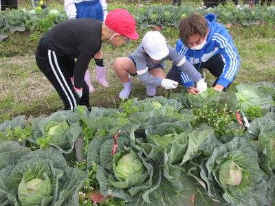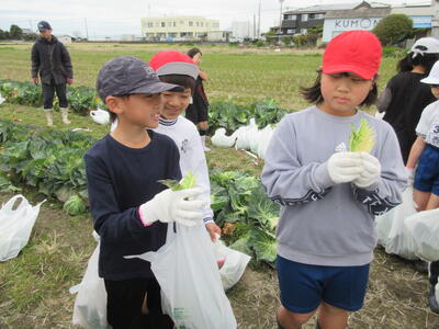 キャベツ本体を横にかたむけると切りやすくなるというコツをつかみ、何個も切っている子供がいました。中には、収穫しながら試食をさせてもらった子供もいて、「あまい!」、「おいしい!」と言いながらニコニコしていました。