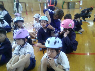 警察や八代交通安全協会の方々においでいただき、まず体育館で、自転車の正しい使い方や乗り方、ヘルメットの正しいかぶり方などを教えていただきました。子供たちは、教えてきた抱きながら、持ってきたヘルメットのひもの調整を行いました。正しくヘルメットをかぶらないと、頭を守ることができなくなってしまいます。今回学んだ正しい着け方を守って、自分の命を守ってほしいと思います。