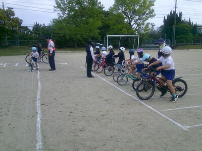 次の時間には、運動場に出て、実際に正しい自転車の乗り方を教えていただきました。ブレーキは3回に分けてかけることで、きちんと停止線に止まることができます。事故を防ぐために、今後も正しく乗ってほしいと思います。