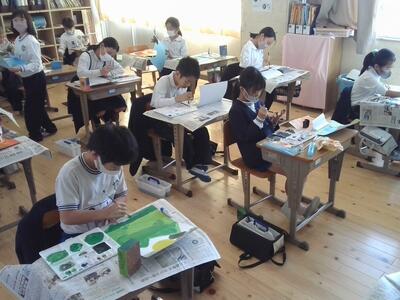 図工「くぎうちトントン」の前半の学習では、釘を最大90本打って釘打ちの練習をしました。そして、後半の学習では、釘を打つ木の背景となる絵を作成しています。