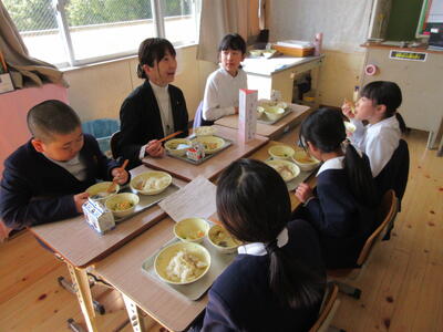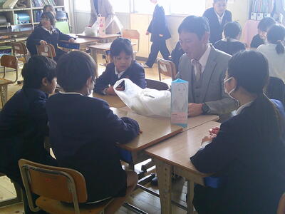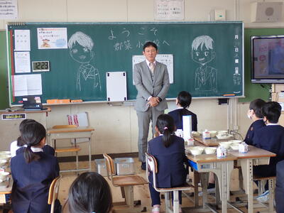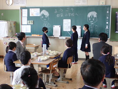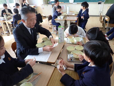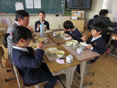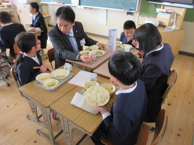 全国学校給食週間にちなんで、本日、八代市長様、教育長様はじめ総勢6名の方が来校され、3年教室で子供たちと一緒に給食を食べられました。
