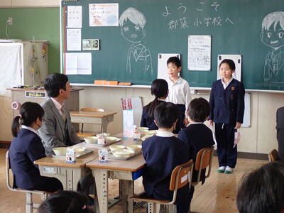 歓迎の言葉やお礼の言葉、パクパク係の献立紹介とクイズなど、子供たちは大活躍でした。また、食事中の会話もどの班も弾んでいて、よい思い出になったことと思います。最後に郡築小学校で収穫した野菜の詰め合わせをお土産としてお渡ししました。