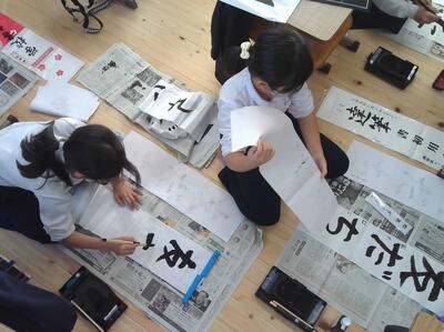机を縦にして練習する子供、床に新聞紙を広げて練習する子供、それぞれ書きやすい方法で練習しています。