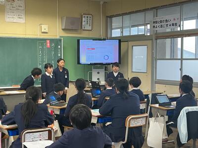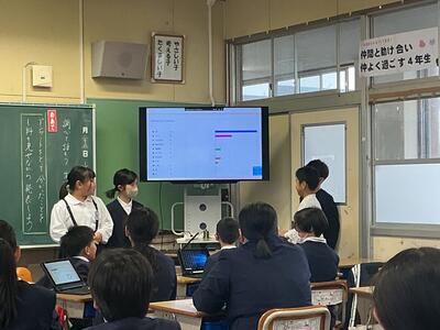 どの班も役割分担をしながら、結果を報告することができていて感心しました。指で示しながら説明したり、「予想通り(予想とは違って)」や「最も多かったのは〇〇〇で、▢人でした。」などと述べながら正確に伝えていました。