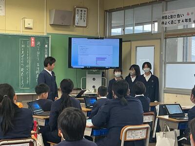 先日、質問項目の作成をMicrosoft Formsを使って行ったことを紹介しましたが、本日は、その集計結果(円グラフや棒グラフ)をテレビ画面に示しながら報告し合う活動をしました。