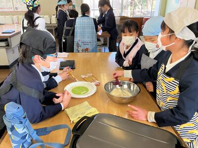 本日3・4時間目に、食育の一環として、ほうれん草を使ったホットケーキ作りを行いました。