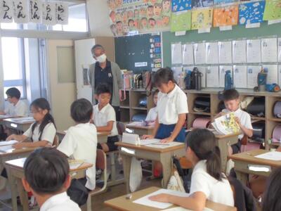 第4地域包括支援センターの方に来ていただき、「認知症サポーター養成講座」を受けました。認知症になるとどういう症状がでるのか、家族や周りの人はどういうふうに接したらいいのかを教えていただき、「くしゃくしゃ笑顔とや・さ・し顔」というお話を聞きました。最後に感想を書いてもらいましたが、自分のひいおじいちゃん、ひいおばあちゃんのことを思い浮かべながら、「今度会ったら優しく接したいです。」と発表してくれました。