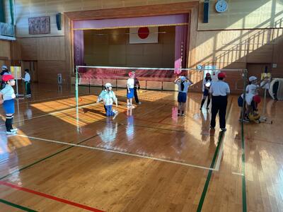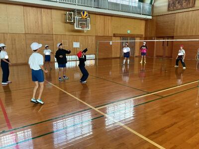 ゲーム前に、サーブ練習、ラリー練習(ボールをつなぐ練習)に分かれ、自分が行いたい練習を決定して取り組んでいます。その成果でゲーム中にサーブが入るようになるなど、どの子供も楽しく学習できています。