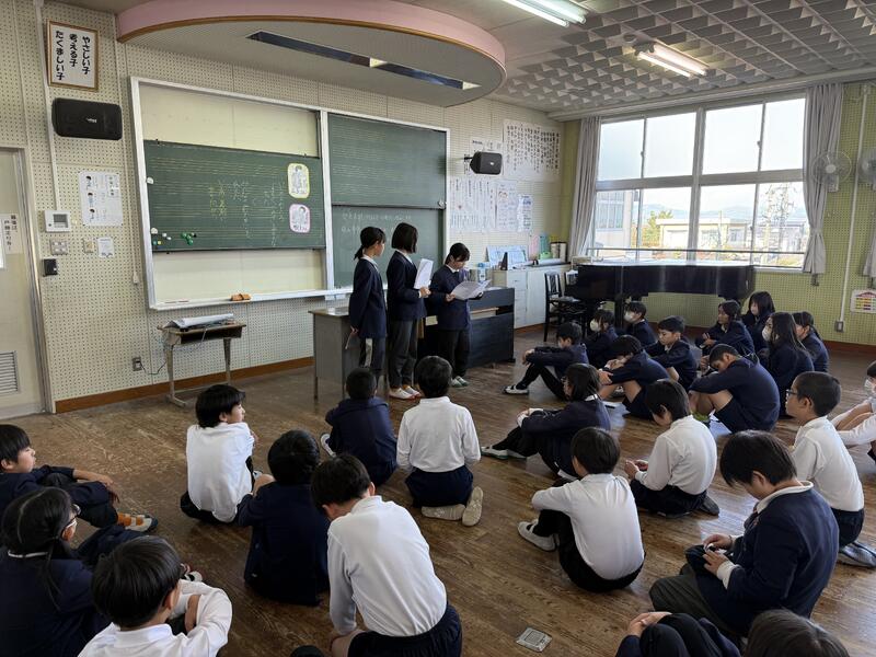 人権集会では、6年生の学習の成果を聞いたり、5年生の代表3名が人権学習で学んだことを発表したりしました。
