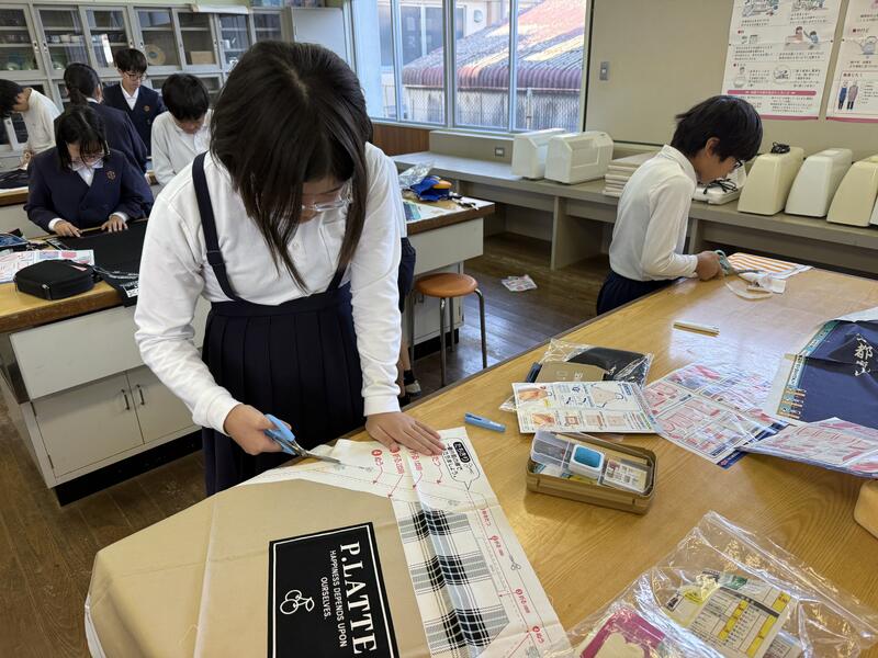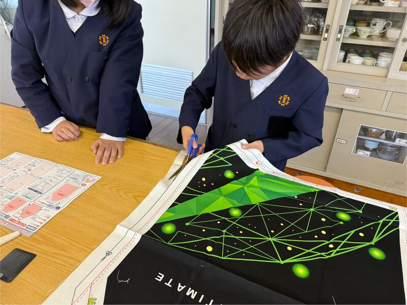 本日はまだミシンは使わず、布をたつ行程をていねいに行いました。エプロンの布が大きく、はじめは切りづらそうにしていましたが、裁ちばさみを使うときのポイントを意識しながら、ていねいに切っていくことができました。
