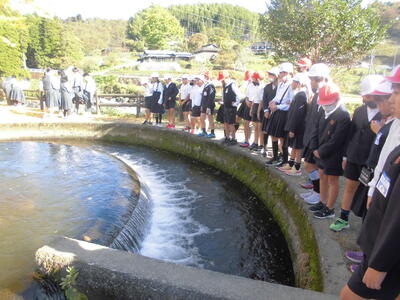 放水を見ました。橋の上を実際に歩いたり、円形分水に行って水がどのように通潤橋まで流れていくのかを勉強し