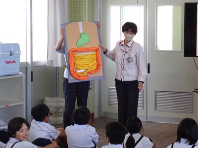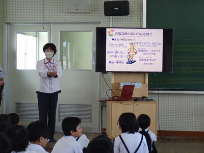 当日は、お二人の方にご来校いただき、うんちの状態から、食べ物の栄養素を吸収する腸の大切さや腸における乳酸菌のはたらき、よいうんちを出すための生活習慣についてわかりやすくお伝えいただきました。