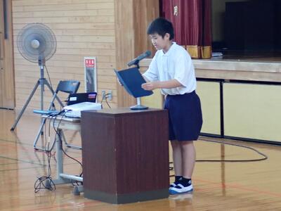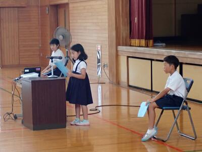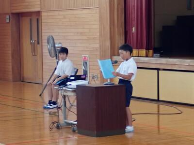 会では、まず、代表児童(2年、4年、6年)が「1学期を振り返って思ったこと」をテーマにした作文を発表しました。1学期に頑張ったことや思い出などを堂々と発表していて感心しました。