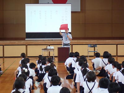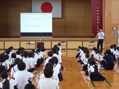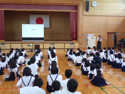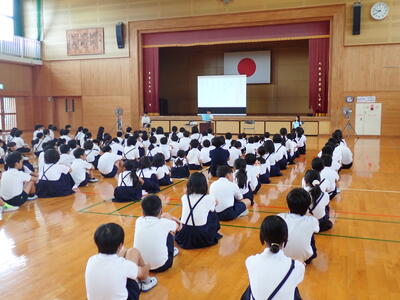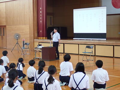 次の校長講話では、1学期の学校行事や教育活動を写真で振り返りながら、その多さに着目させると共に、その時々で真面目かつ一生懸命に取り組んだ子供たちは、大きく成長していることを伝えました。そして、「学校には、このように成長するチャンスがいっぱいあり、そのすべてがみんなに平等に与えられています。それをつかむか、逃すかは自分の取り組み方次第です。」と話し、普段の授業をはじめ、学校行事並びに教育活動に、真面目かつ一生懸命に取り組むことの大事さを伝えました。