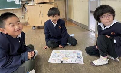席替えの後、新しい班の友達と「新年すごろく」をしました。