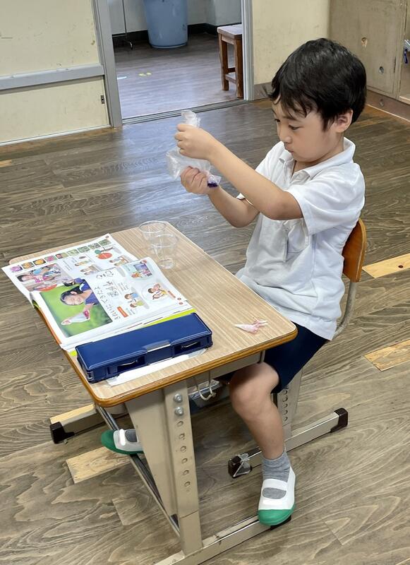 色水づくりでは、「むらさき色の水なのに、染めたらピンクになったよ。」「きれいな色だね。」など、たくさんのつぶやきが聞かれました。