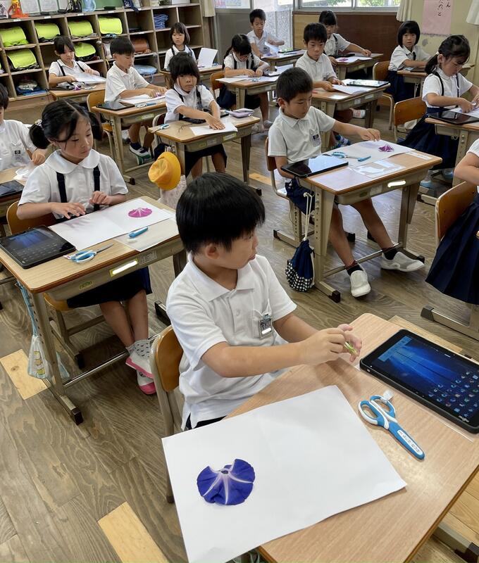 生活科の活動で、咲いた花を使って、色水づくりや、こすり染めを行いました。