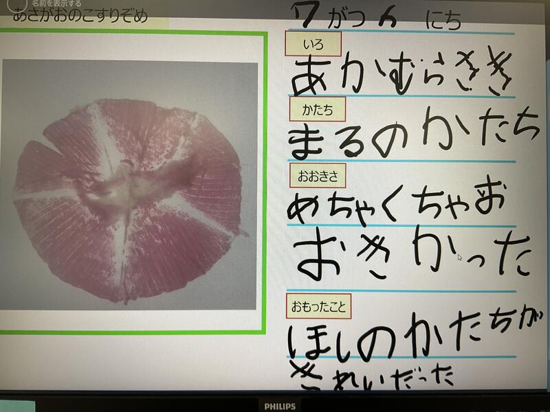 こすり染めは、活動の様子をペアの友達にタブレットで撮ってもらい、「発表ノート」で、3枚のシートにまとめました。タブレットでまとめる学習は、授業参観で行い、おうちの人に見守られながら楽しくできました。