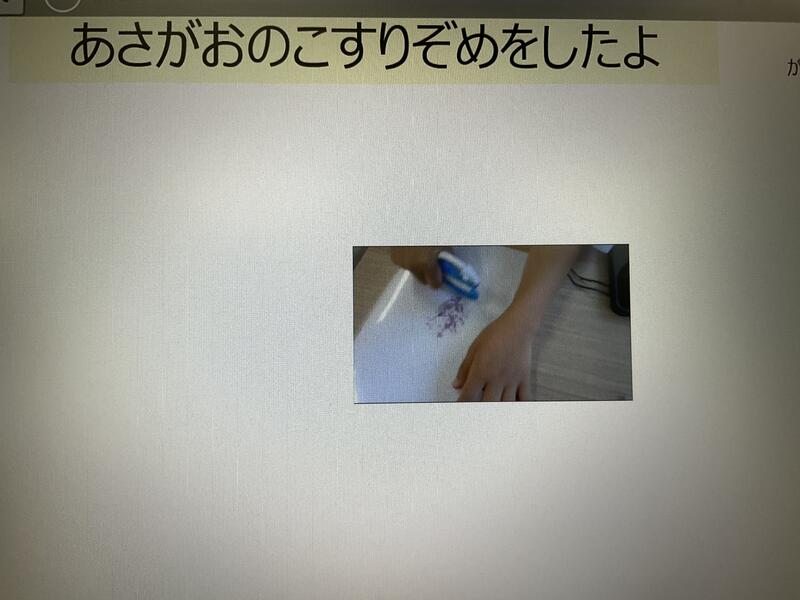 こすり染めは、活動の様子をペアの友達にタブレットで撮ってもらい、「発表ノート」で、3枚のシートにまとめました。タブレットでまとめる学習は、授業参観で行い、おうちの人に見守られながら楽しくできました。