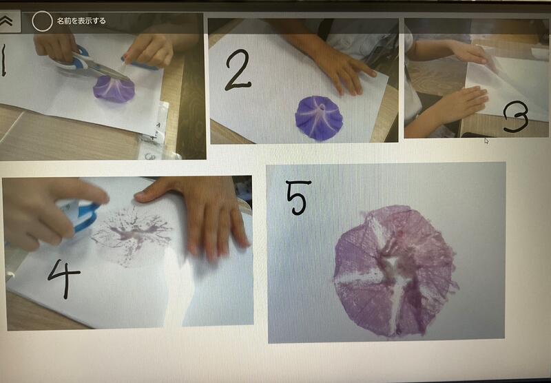 生活科の活動で、咲いた花を使って、色水づくりや、こすり染めを行いました。